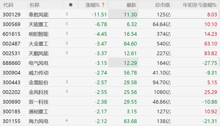A股风电概念股集体下跌,泰胜风能跌超11%