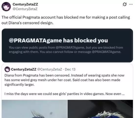 事件的导火索是卡普空官方社交媒体账号拉黑了一位名为@CenturyZetaZ的用户。该用户此前公开发文,质疑游戏中呈现幼童形象的机器人主角戴安娜(Diana),其最终版服装设计相较早期概念有所调整,并称之为“和谐化”修改。