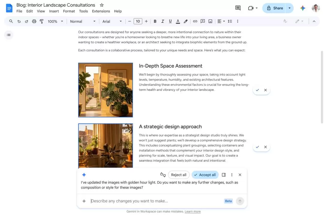 如今的Gemini in Docs不仅能撰写内容,还能自动处理文档中的评论:理解同事的反馈意见,并直接对文档进行相应修改。更重磅的是,它能基于业务数据自动生成信息图表,并能一次性编辑多张图片,确保视觉风格的一致性。
