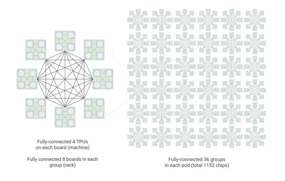 在芯片设计上,TPU 8i采用了分层的Boardfly拓扑结构。其基础构建块由四个全连接芯片组成,向上发展为八个主板的全连接组,最终由36个这样的组全连接成一个完整的TPU 8i pod。