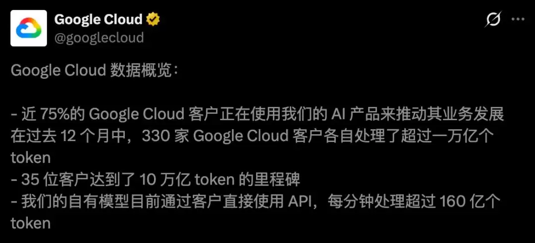 皮查伊在会上描绘了一幅近乎“恐怖”的增长曲线:Gemini每分钟处理的Token数量已从100亿飙升至惊人的160亿;35家顶尖客户迈入了“10万亿级”参数俱乐部。更引人注目的是,谷歌内部75%的新代码由AI生成,多智能体协作系统甚至让复杂代码迁移项目的效率提升了6倍。