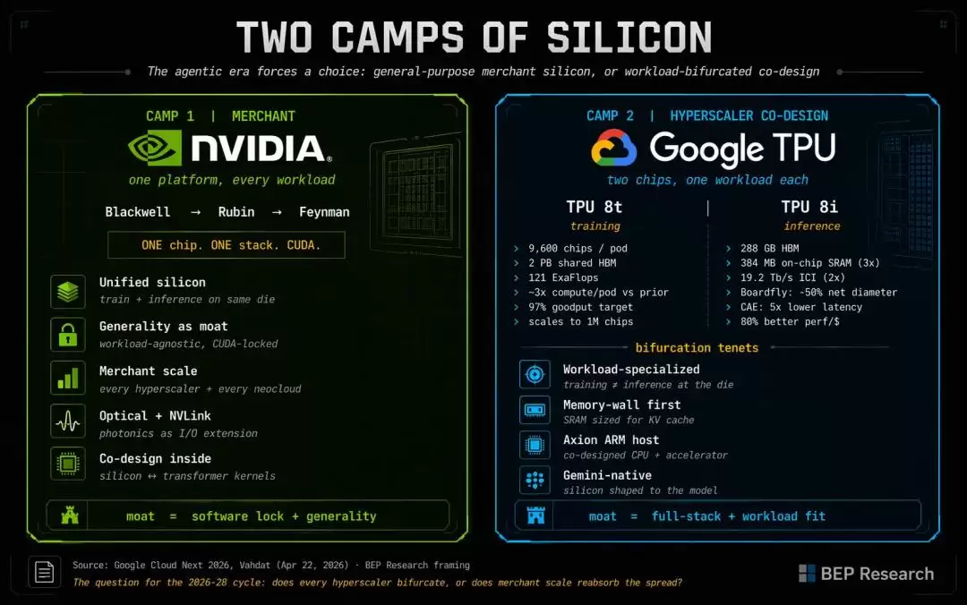 训练与推理双线出击,其意图再明显不过:直指英伟达的核心腹地。甚至有网友制作了详细的对比图,清晰勾勒出英伟达GPU与谷歌TPU的对战全貌。