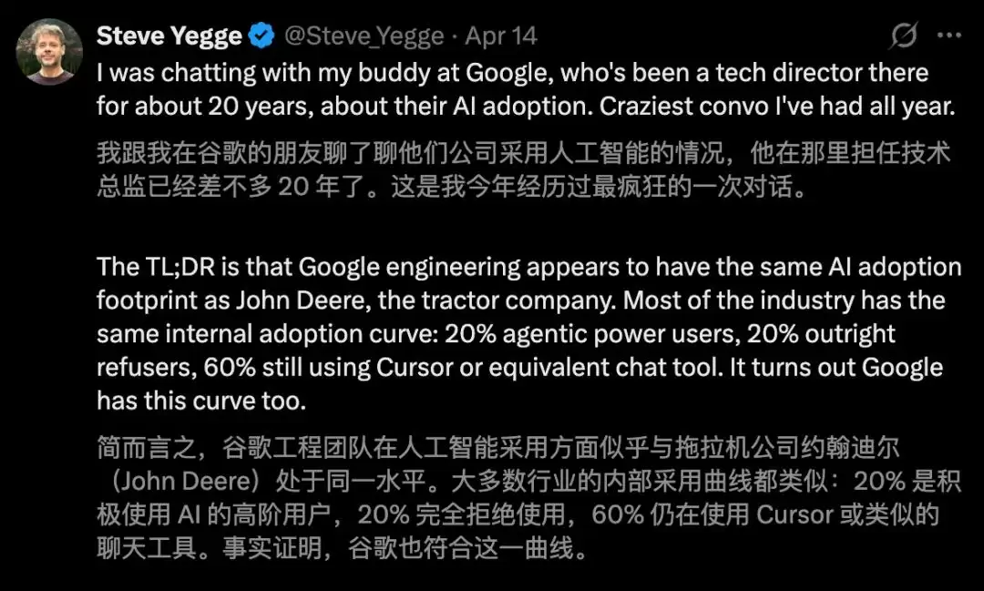 这一反常举动引发了内部讨论。不少工程师私下坦言,在部分编程任务的表现上,Gemini确实暂时逊色于Claude。而就在此时,谷歌正全力推进全员AI化,并将AI工具的日常应用深度纳入绩效考核体系。