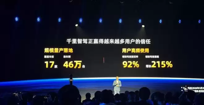 经营层面,千里科技披露的关键业务数据,显示其商业化转化能力已初步显现。截止2026年3月31日,已有17款车型、合计46万辆车搭载了千里科技新一代智能驾驶辅助技术。几个关键指标颇为亮眼:辅助驾驶激活率达到92%,辅助驾驶里程增长215%,泊车功能使用增长144%,月均避险达到32万次。基于此,千里科技在2025年已实现了收入和利润的双增长。