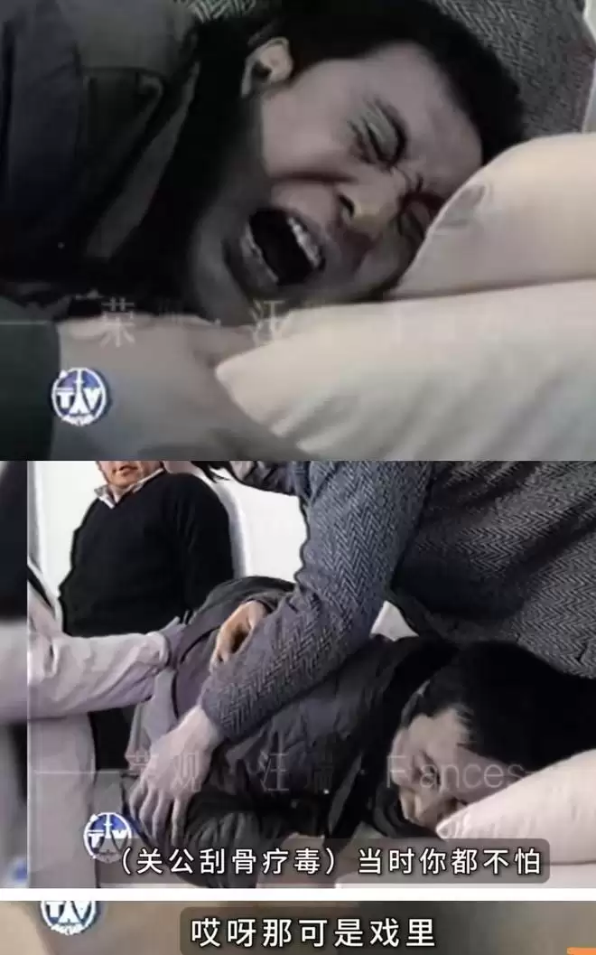 其中,有几个片段格外令人印象深刻。“关羽”陆树铭曾因骑马摔伤腰部,治疗时需要抽出淤血,剧痛让他忍不住叫出声。一旁的医生半开玩笑地反问:“(关公)刮骨疗毒你都不怕,这个你怕什么?”一句话,戏里戏外,瞬间贯通。而“刘备”孙彦军在一场悼念关羽的戏中突然忘词,懊恼得连连甩手,急得直跳脚。有网友精准点评:“连这甩手的动作,都特别有古人的神韵。”