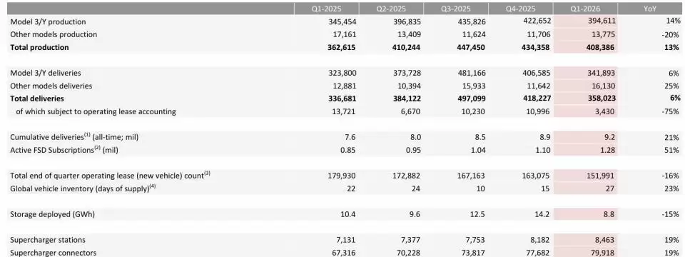 特斯拉2026年第一季度汽车产量和交付数据