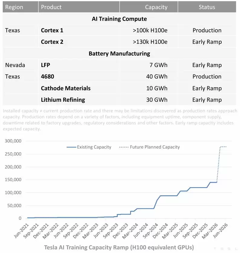 钱主要花在了两个地方:电池制造和AI算力。内华达州和德克萨斯州的电池相关工厂正处于产能提升阶段;而用于AI训练的算力集群规模正在急剧膨胀,从公布的数据看,计划中的总训练能力已增长至超过30万颗H100等效GPU。