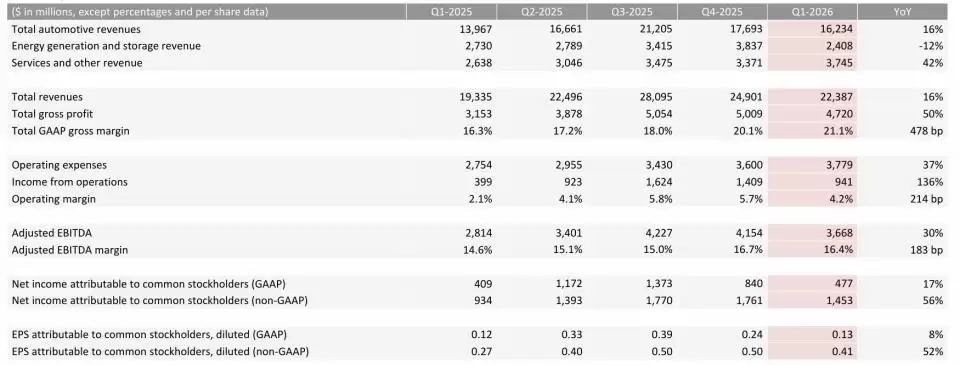 北京时间4月23日凌晨,特斯拉发布了2026年第一季度财报。结果有些出人意料:在营收略低于市场预期的背景下,其利润表现却大幅超出预期,盘后股价应声上涨超过4%。这仿佛在向市场传递一个信号:那个熟悉的利润引擎,又回来了。