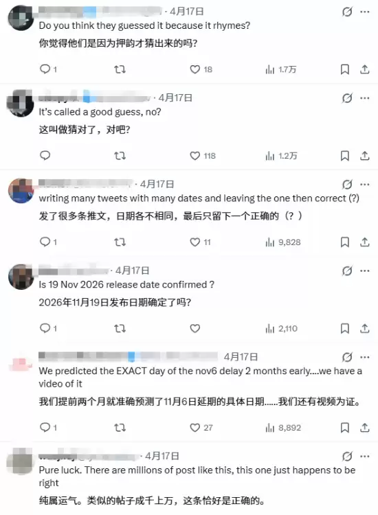 还有一种分析听起来也挺有道理:会不会是发布者当初同时发布了多条日期各不相同的推文,等到游戏发售日真正公布后,再悄悄删掉错误的,只留下正确的那一条“以证预言”?这种操作在互联网上可不算新鲜。