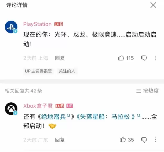 先是PlayStation官方号留言:“现在的你:光环、忍龙、极限竞速…… 启动启动启动!”——好家伙,直接把对手平台的看家IP点了个遍。紧接着,Xbox官方号也迅速接招,回复道:“还有《绝地潜兵》《失落星船:马拉松》…… 全部启动!”,同样精准“投喂”了索尼这边的热门作品。末了,双方还不忘配上那个经典的握手表情。