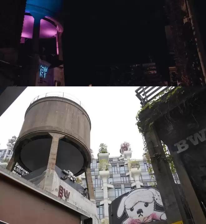而剧中作为转场标志的那座水塔,来头也不小。它建于上世纪30年代,曾是上海春明粗纺厂的水泵中枢和蓄水塔。经过一番“修旧如旧”的改造,如今它以“珀德BWT水塔咖啡”的身份重生,最大限度地保留了工业印记,迅速成为园区里人气最高的打卡点之一。
