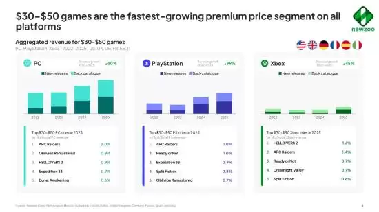根据 Newzoo 发布的《2026年PC与主机游戏报告》,在 PC、PlayStation 和 Xbox 三大平台上,30-50美元档位的游戏贡献了近期收入的很大一部分,成为增长最快的细分市场。