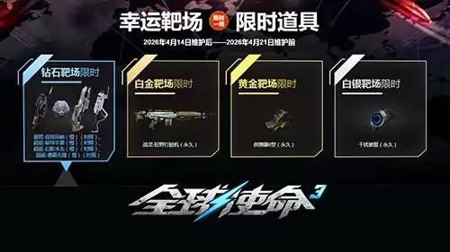 真正的重头戏在这里:从2026年4月14日维护后,一直到4月21日维护前,幸运靶场将迎来年度级的限时内容。钻石靶场将限时加入四款橙色时限武器,包括“暴君-苍穹回响”、“超能-制导手雷”、“超能-幻影冲击”以及“超能-寒霜先锋”。这无疑是追求顶级火力的玩家不容错过的机会。当然,活动也兼顾了不同需求的玩家:实用的“供弹器II型(永久)”将限时进入黄金靶场,而“干扰装置(永久)”则会出现在白银靶场。无论你是热衷暴力输出的突击手,还是擅长控场支援的战术家,都能在靶场中找到心仪的装备,全方位提升自己在战场上的表现。
