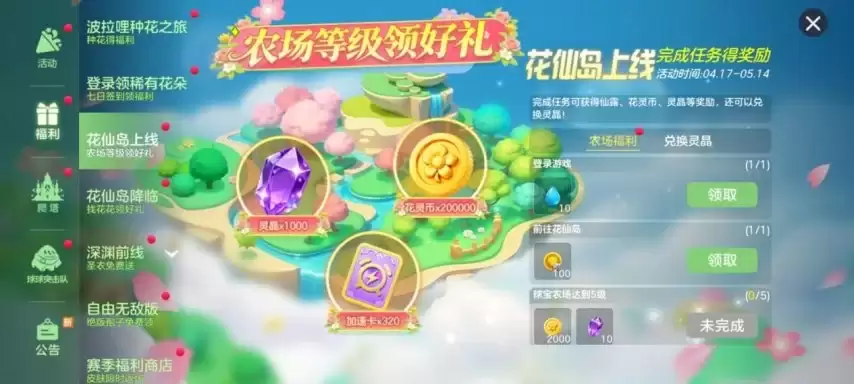 专属庆祝活动同步开启!4月17日至5月14日,只需提升你的花仙岛农场等级,就能直接领取海量好礼。奖励池非常诱人,最多可以免费获取1000灵晶、200000花灵币、320张加速卡等资源。还等什么?赶快进入游戏,努力提升等级,兑换这些实实在在的成长福利吧。
