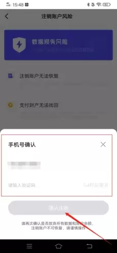 5. 为了确保是本人操作,接下来需要完成身份验证。系统会向你注册时使用的手机号发送一条信息验证码。收到后,在输入框内填写这串数字,然后点击最下方的「确认注销」按钮。