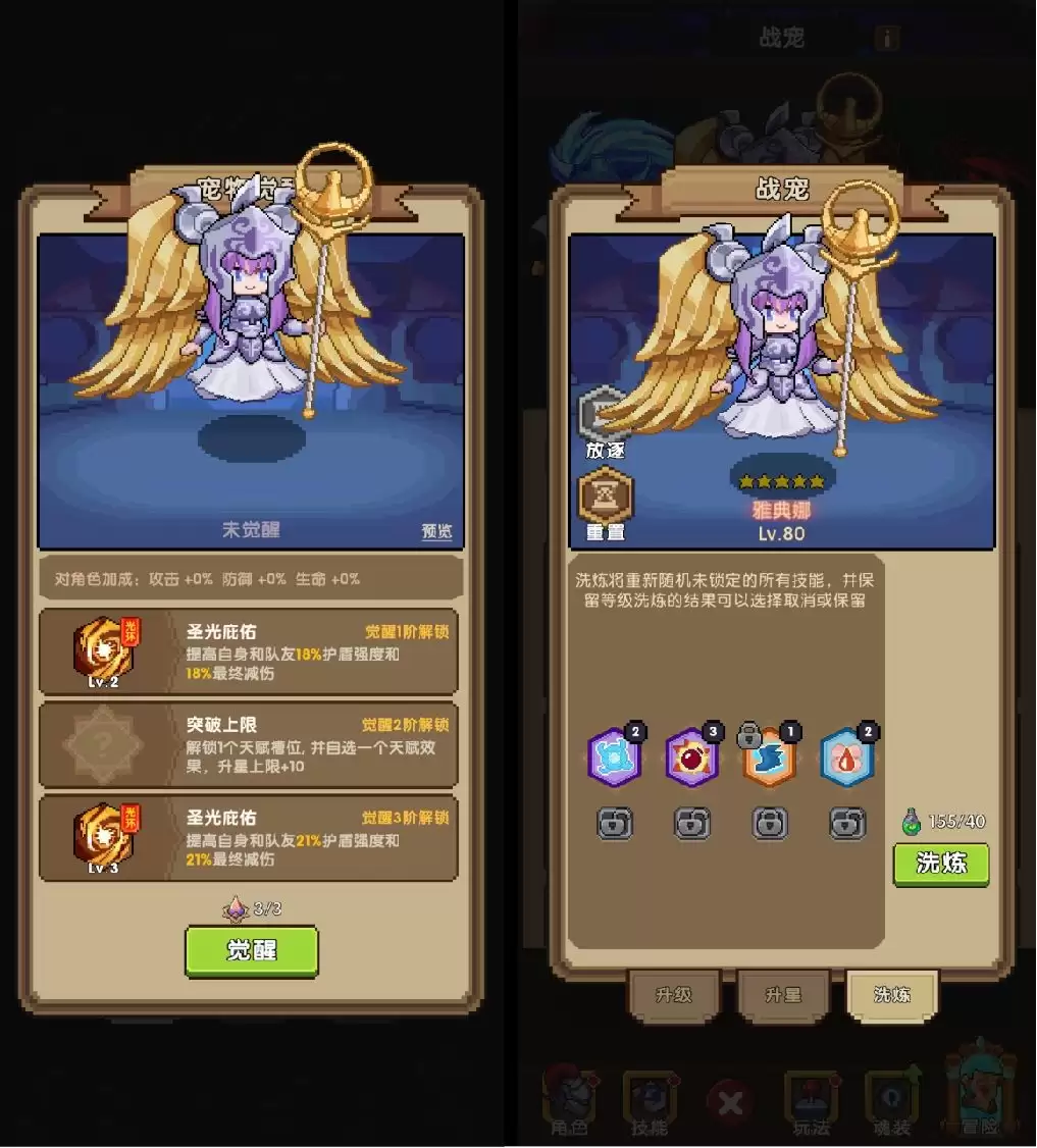 「觉醒」:消耗「觉醒石」可以对宠物进行觉醒。觉醒等级直接提升光环技能的效果,并且还能解锁额外的天赋槽位,是宠物后期的成长关键。