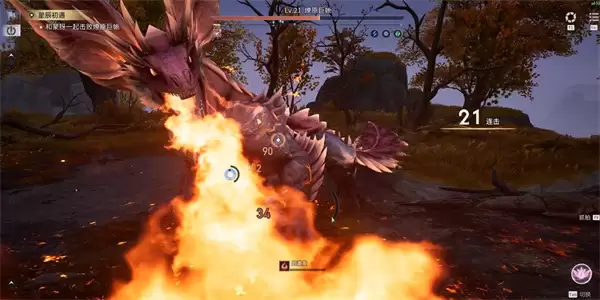 战斗开场,燎原巨蜥的常规手段就那几样:时不时朝正前方扇形区域喷火,或者用尾巴朝着你的位置连续拍地。对付拍地,连续进行完美闪避是标准解法。