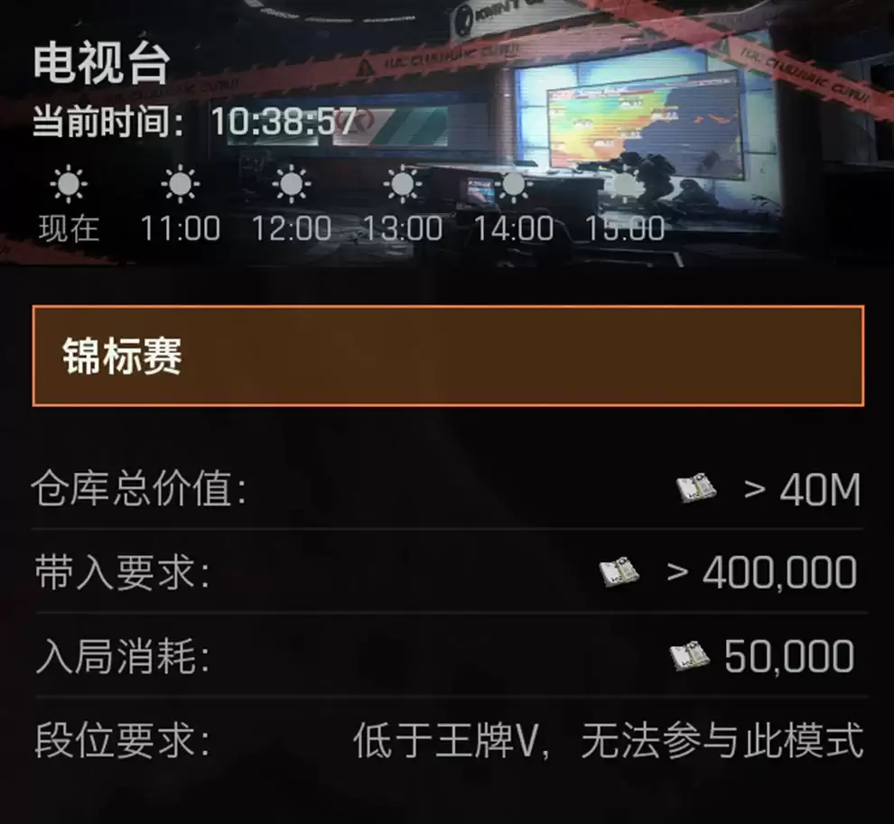 首期战神锦标赛的战场,设定在强化封锁区的卡莫纳电视台。想要参与这场顶尖较量,需要满足两个硬性条件:首先,特遣队员的赛季常规段位需达到王牌V以上;其次,仓库价值需要达到40M。只有真正的精锐,才有资格踏入这个赛场。