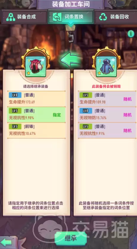 如果说合成功能旨在“创造可能性”,那么词条置换功能则专注于“实现精准优化”。该功能允许你将一件装备上的特定修饰词条,迁移到另一件装备上。参与置换的两件装备都需要至少拥有3条修饰词条,但对装备品质没有强制性要求。操作时,玩家需要指定接收词条的目标装备,以及希望被替换的具体词条位置,系统随后会从源装备中随机选取1条词条转移过去。这为玩家提供了定向调整和优化装备属性的宝贵机会,显著降低了获取理想毕业装备的难度。