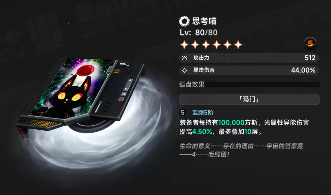 小吱的专武「思考喵」其效果与角色持有的「方斯」数量直接挂钩。武器的高级属性提供暴击伤害加成,而弧盘效果则根据方斯数量提供光属性伤害提升。当方斯储备达到一百万时,即可获得满额45%的光属性增伤。因此,装备「思考喵」时,建议预留一百万方斯作为弧盘效果的“启动资金”。这把武器的泛用性同样值得关注,未来若有其他光属性气态输出角色登场,「思考喵」很可能依然是版本强势选择。
