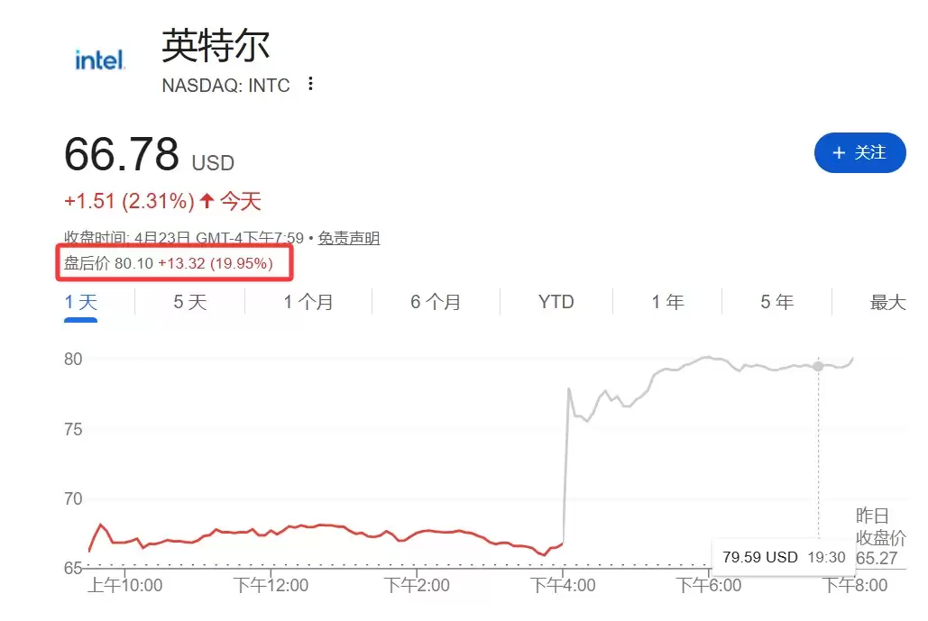 4月23日盘后,英特尔股价暴涨20%,逼近80美元,创下了互联网泡沫时代以来的新高。