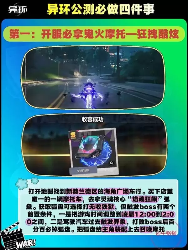 获取这个弧盘,挑战“无手铁狱”是个明确选择。但这里有个关键:触发Boss需要满足两个前置条件。第一,把游戏内时间手动调整到凌晨12:00到2:00之间;第二,务必驾驶汽车前往指定地点,才能触发异象。成功击败Boss后,弧盘是百分百掉落的。拿到弧盘后,给主角装配上,召唤摩托。当你骑上去的瞬间,蓝紫色渐变的鬼火拖尾效果直接拉满,视觉体验非常酷炫。
