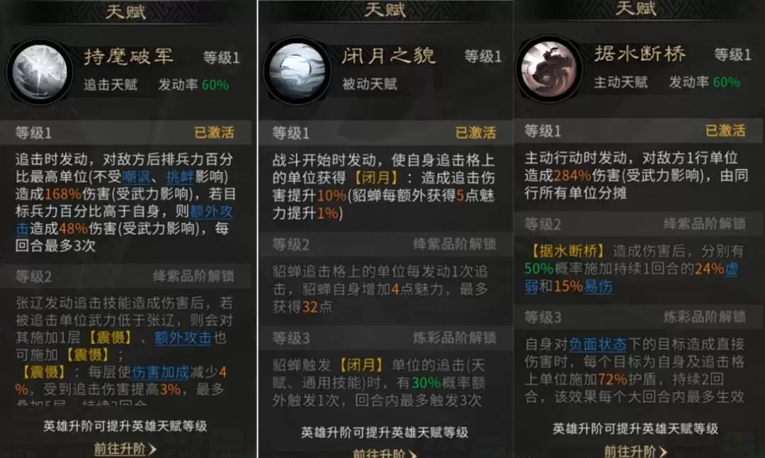 光有发动机还不够,还需要“加油站”。貂蝉的天赋【闭月之貌】正好扮演这个角色,能稳定为追击单位提供增伤buff。再给她配上一些减益或辅助技能,就能持续放大主C张辽的伤害天花板。