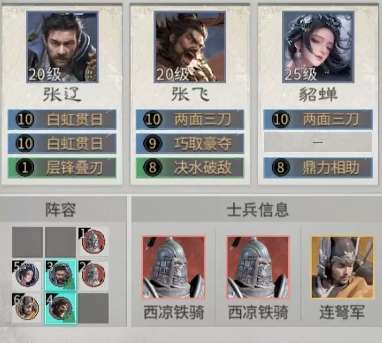 兵种带法及站位:名将玩法里的敌人可不是吃素的,伤害相当高。所以,队伍里需要安排两支西凉铁骑来扛住主要伤害。别忘了,在貂蝉下方再布置一支连弩军,它能有效补充队伍的整体输出。