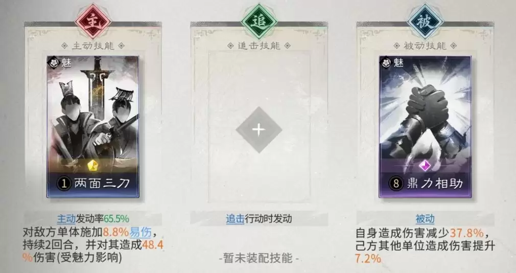 追击技能带【巧取豪夺】是个不错的选择,在提升自身武力的同时还能造成伤害,攻防一体。