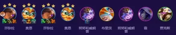 核心英雄一目了然:莎弥拉、奥恩、努努、布里茨(机器人)、霞、贾克斯。具体上阵时,你需要派出:莎弥拉、奥恩、莎弥拉、奥恩、努努、机器人、努努、霞、贾克斯。没错,双莎弥拉与双奥恩是阵容的基石。