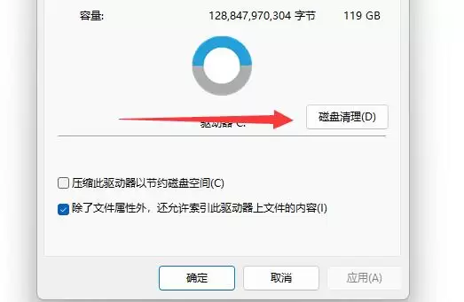 3、在弹出的属性窗口中,你会看到中间有一个“磁盘清理”按钮,点击它。