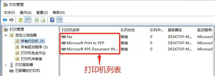 除了查看任务,这个工具还能帮你统览全局。你可以在左侧依次点击【自定义筛选器】→【所有打印机】,那么右侧就会显示出本机上安装的所有打印机列表。这对于管理多台打印机或者检查设备状态来说,非常方便。