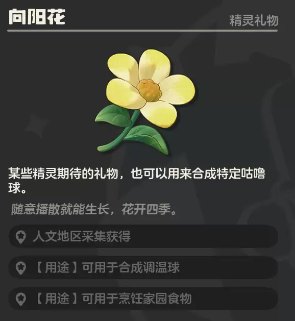 向阳花:顾名思义,它喜欢阳光充沛的开阔地带,主要分布在湖区的人文活动区域。采集到的向阳花,主要用于制作“调温球”和另一类家园食物的烹饪。