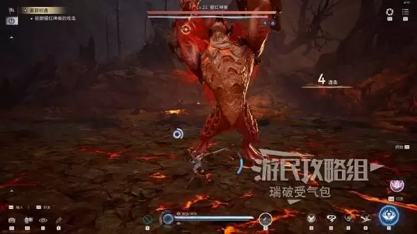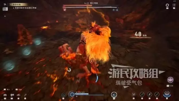 偶尔,BOSS砸地时周围会出现黄圈,地面显现熔岩痕迹。这意味着随后地面会燃烧,并且裂缝中会喷出火焰造成二次伤害。最稳妥的办法就是直接远离着火区域。