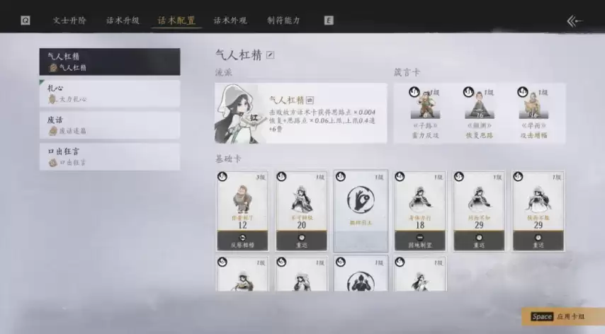 看得出来,开发团队这次是下了狠功夫,对话术系统进行了深度重构。它不再只是一个辅助玩法,而是摇身一变,成了兼具策略性与沉浸感的核心对抗机制。玩家开局就得做个选择:从“大力扎心”、“气人杠精”、“废话连篇”、“口出狂言”这四大流派中择一入门,奠定自己独特的辩论风格。贴心的是,玩家过往在“文士营生”中的培养成果,会直接转化为【话术大全】道具,用于升级卡牌。这一设计,既保障了老玩家的积累不被浪费,也让新玩家能够轻松上手,可谓两全其美。