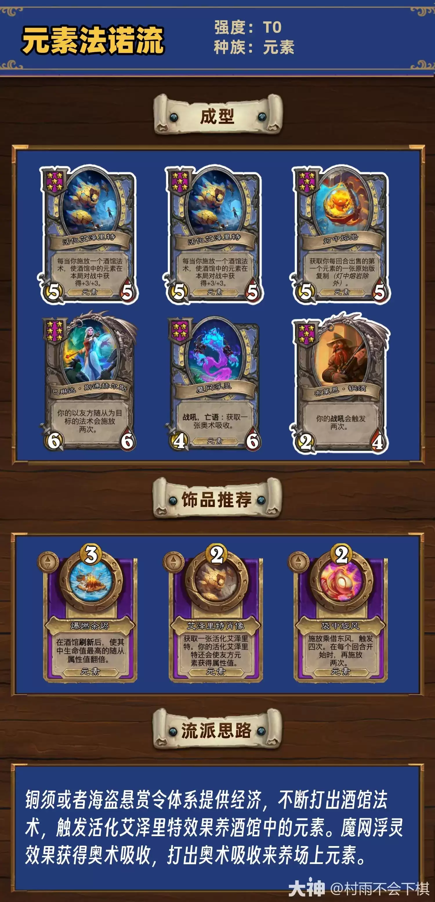 爆发期(诺兹多姆回合):这是锁定胜局的关键回合。通常在7费或8费执行。确保场面相对干净(防范AOE),手牌中储备至少3-4个或以上的元素随从。拍下“诺兹多姆”,将所有随从变为1费,随后进入表演时间——将手牌中的元素倾巢而出,并配合“元素使者布鲁坎”等战吼,建立起压倒性的场面优势。