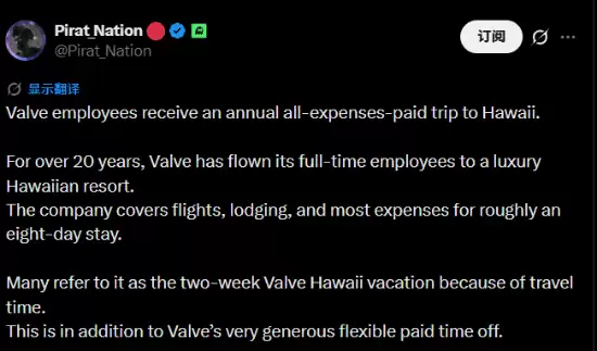 Valve的“隐藏福利”:一场持续二十年的夏威夷豪华之旅 最近,游戏圈被一条消息刷屏了。知名博主@Pirat_Nation爆料,游戏巨头Valve(俗称V社)内部有一项延续了二十多年的“传统艺能”——每年为全职员工提供一次全额报销的夏威夷豪华度假。 具体是怎么个豪华法?根据披露的信息,这项福利堪称“