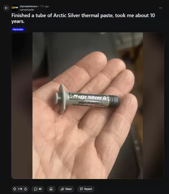 最近,Reddit上的一则帖子在玩家圈里小火了一把。一位用户晒出了一管彻底用尽的Arctic Silver硅脂,并配文说,这管硅脂“花了大约10年才用完”。