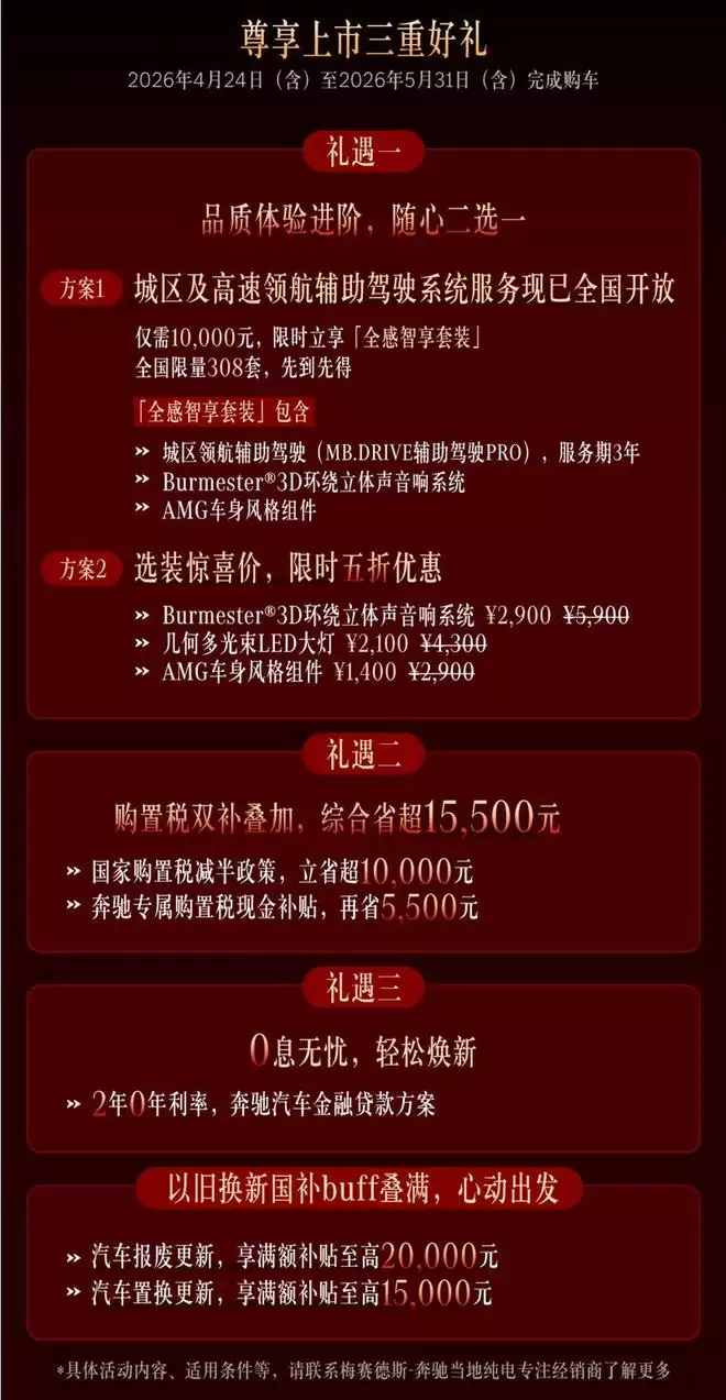 价格有诚意,上市权益也得跟上。奔驰宣布,对于在4月24日至5月31日期间完成购车的用户,将赠送3重礼遇。其中最值得关注的,是限量308套的“全感智享套装”。