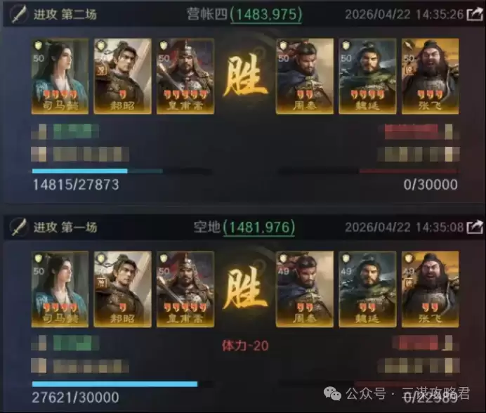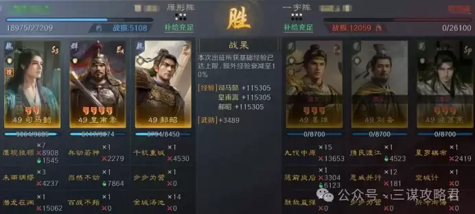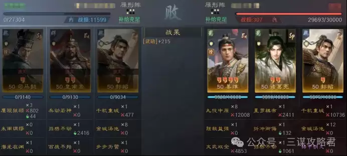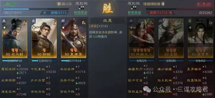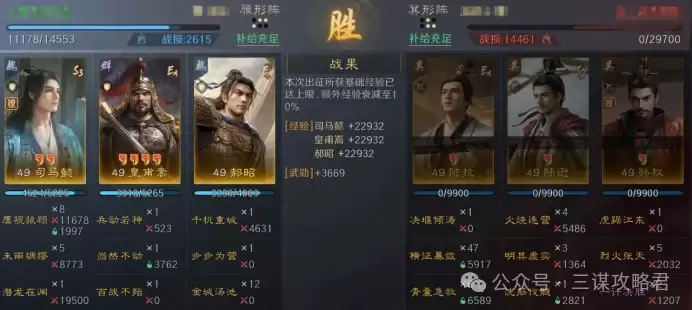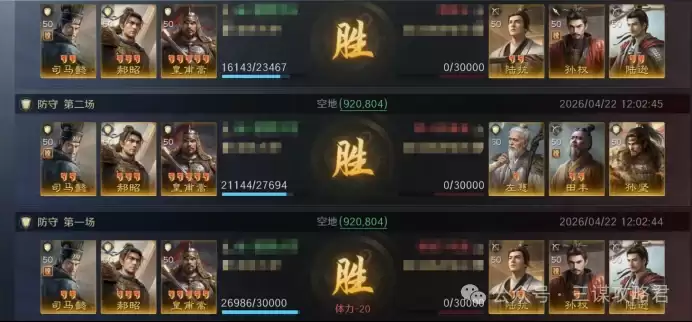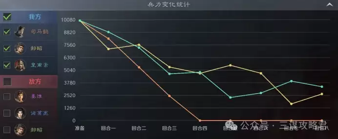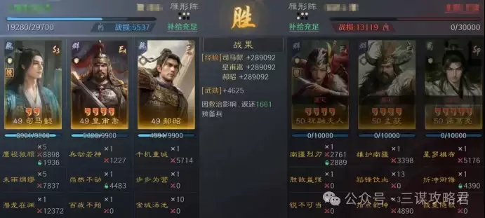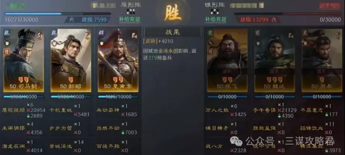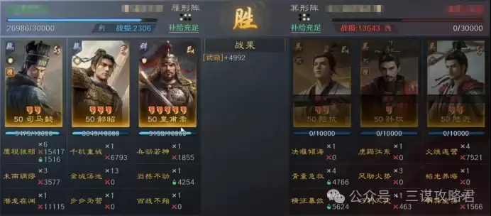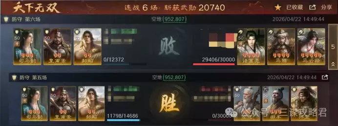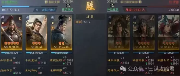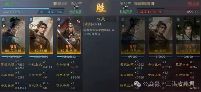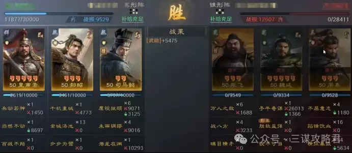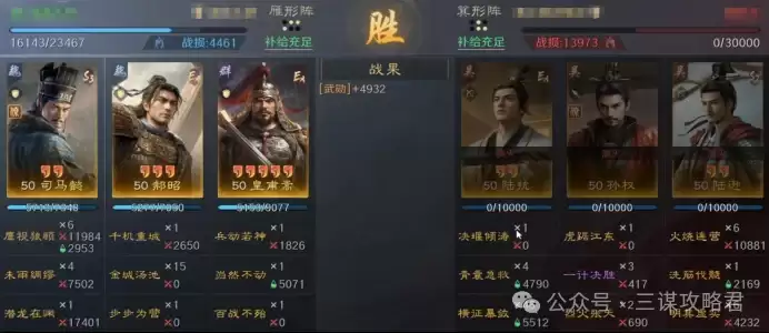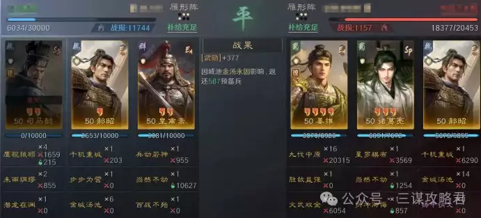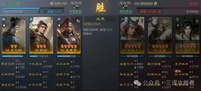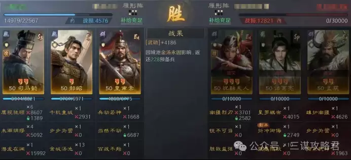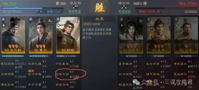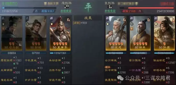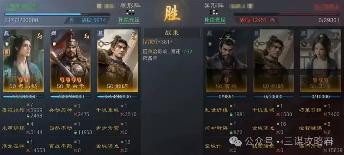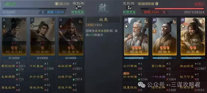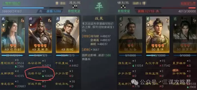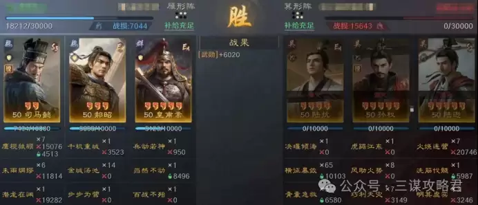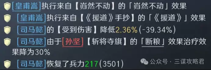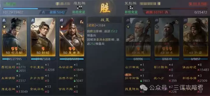 然而,对阵左田孙时情况就不同了。由于皇甫嵩与郝昭都是高统武将,司马懿很容易成为田丰和群孙坚的“锁头”目标。再加上【斩将夺旗】带来的断粮效果,使得【岿然不动】的治疗无法有效生效,最终导致司马懿被快速击败。一旦司马懿倒下,剩下的两位武将便难有作为。