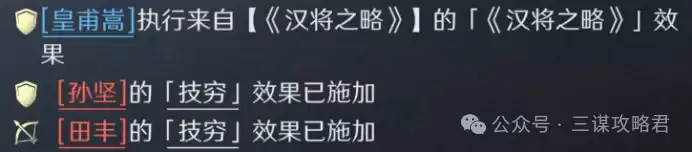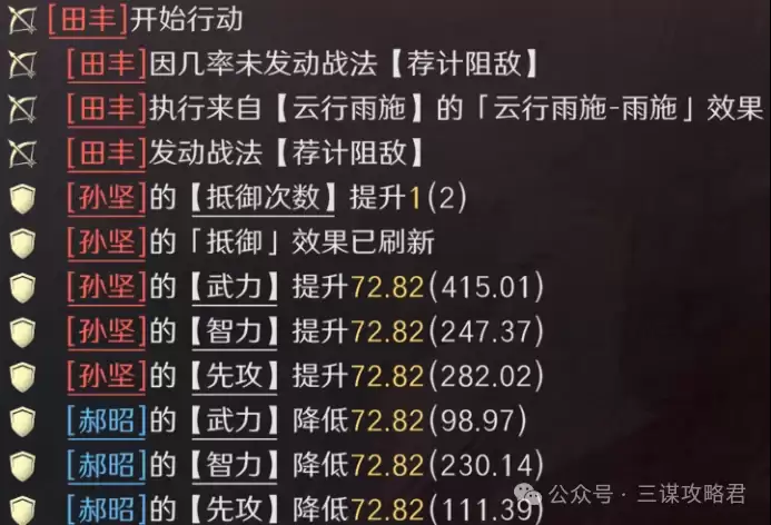 当然,如果所在区服左田孙实在过多,也可以考虑变阵:将郝昭改为全智力加点,使其成为队伍中统率最低的单位,主动吸引田丰与孙坚的火力(田丰不会吸取郝昭的统率)。同时,皇甫嵩的军令效果也能为郝昭弥补一部分损失的统率。再加上皇甫嵩金书开局提供的技穷效果有一定概率命中田丰或群孙坚,如此调整后,也并非没有一战之力。