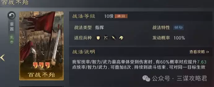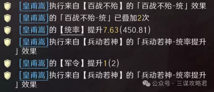 由于阵容中替换了原本提供加成的曹丕,为了确保司马懿的输出不至于乏力,这里选择了携带【百战不殆】来为其提供稳定的智力加成。同时,【百战不殆】也能为皇甫嵩增加统率,使其更快叠加军令层数,进而更早地反哺全队,提升整体统率属性。