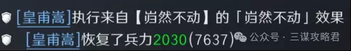 这套阵容的核心机制之一,在于皇甫嵩能为全队提供大量统率。而【岿然不动】的治疗效果受统率影响极大,在皇马盾体系中的恢复量,往往是其他队伍的数倍。再加上【岿然不动】优先治疗兵力最低的友军,这一特性天然克制依赖单点爆发的阵容。