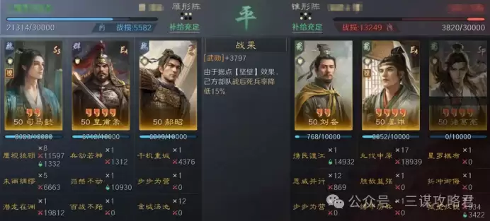 雁形阵能为皇甫嵩和郝昭提供二十点统率加成,直接强化了他们自带战法的效果。至于为什么把【步步为营】交给郝昭携带,原因在于郝昭自身缺乏减伤手段,而皇甫嵩的【兵动若神】会为其施加减伤。将【步步为营】分配给郝昭,可以避免该效果施加到错误目标,导致郝昭因无减伤而被快速击破的情况。