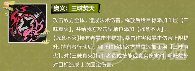 奥义技【三昧焚天】是一个全体范围攻击。释放后,会立即为所有敌方单位附加1层三昧真火,同时为我方所有攻击型角色赋予「战意不灭」增益。这个增益能提升暴击率与暴击伤害,且有数值上限。更关键的是联动机制:每当携带该增益的队友完成一次行动,哪吒就会自动对随机一名敌人追加1层三昧真火。此外,如果哪吒对已经带有三昧真火的目标造成技能伤害或真实伤害,还会额外触发一次固定值伤害。这套机制极大地强化了他的多段输出潜力,尤其适配那些攻击频率高的阵容。