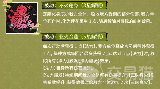 5星被动【业火金莲】是哪吒的节奏发动机。哪吒每次行动可获得1点法力,队友释放言灵技能也能为他额外提供1点法力(每种获取方式每回合上限为2点)。当累计积攒5点法力后,就会触发「法力爆发」状态。在此期间,全队造成的伤害提升,同时三昧真火的灼烧系数也会提高。爆发启动的瞬间,还会为全体敌人追加2层三昧真火。如果配合奥义技使用,完全有可能在首回合就快速铺满5层Debuff,实现高效斩杀。他的援助技能则在登场时即为全体敌人施加1层三昧真火,为整场战斗的持续压制奠定了基调。