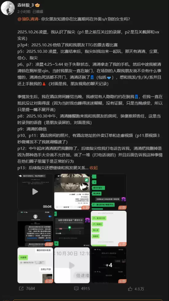 4月16日,微博用户“森林狼_3”实名指控重庆狼队选手清清(本名吴金翔)在2025年10月30日凌晨的一场赛后聚会中涉嫌性骚扰行为。