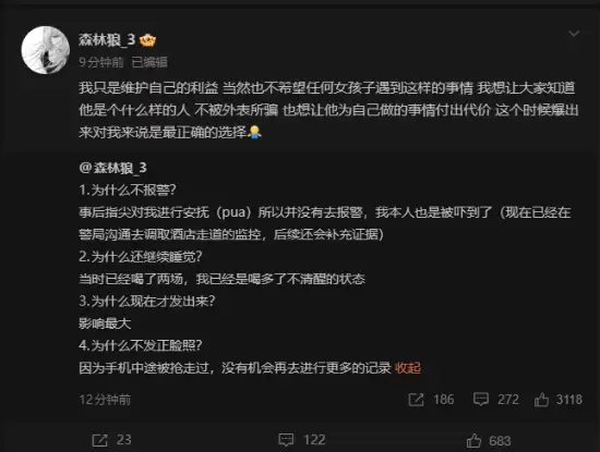 对于时机问题,当事人的考虑是此前认为事件影响过大,因此选择了在当下这个时间点将信息公之于众。