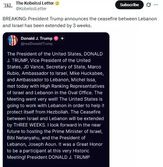 特朗普在声明中提到,美国将与黎巴嫩合作,帮助其应对真主党的威胁。值得注意的是,真主党方面并未参与此次会谈。而原定于周日到期的停火协议,也因此得以延续。
