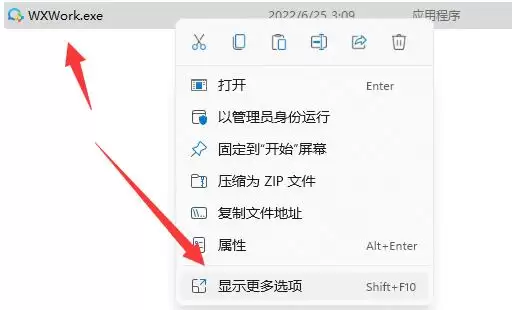 打开文件夹后,重点查看一下源程序文件的图标是否正常。如果源文件图标是完好的,那问题就简单了。在源文件上右键,选择“显示更多选项”。